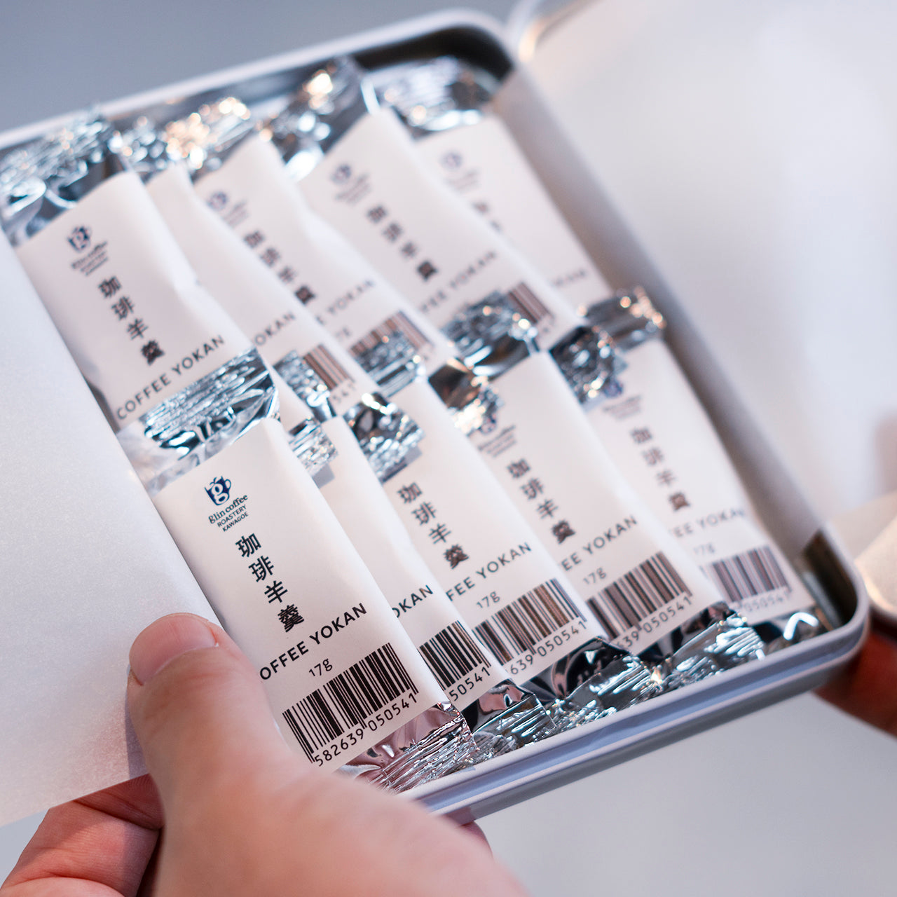 当店のコーヒーを使用したミニサイズの羊羹を、かわいらしい缶に詰めました。